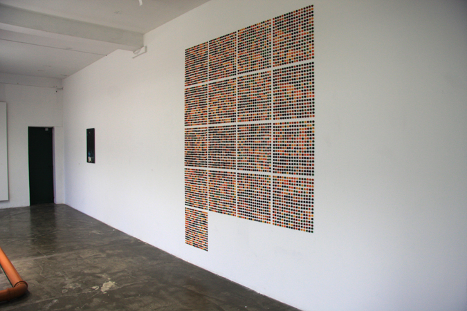 Exploring the force of a pattern rooted in a found object and arranged in a grid. Taking packs of Rowntree fruit gums, with seventeen sweets in a pack, and produced seventeen squares of seventeen columns and seventeen rows.