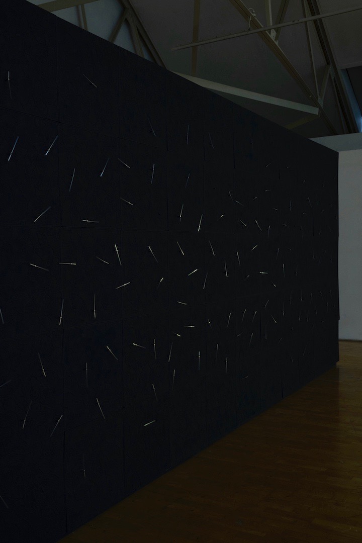 Screen, celling tiles, midnight blue paint, clock parts, second hands