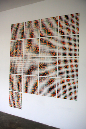 Exploring the force of a pattern rooted in a found object and arranged in a grid. Taking packs of Rowntree fruit gums, with seventeen sweets in a pack, and produced seventeen squares of seventeen columns and seventeen rows.