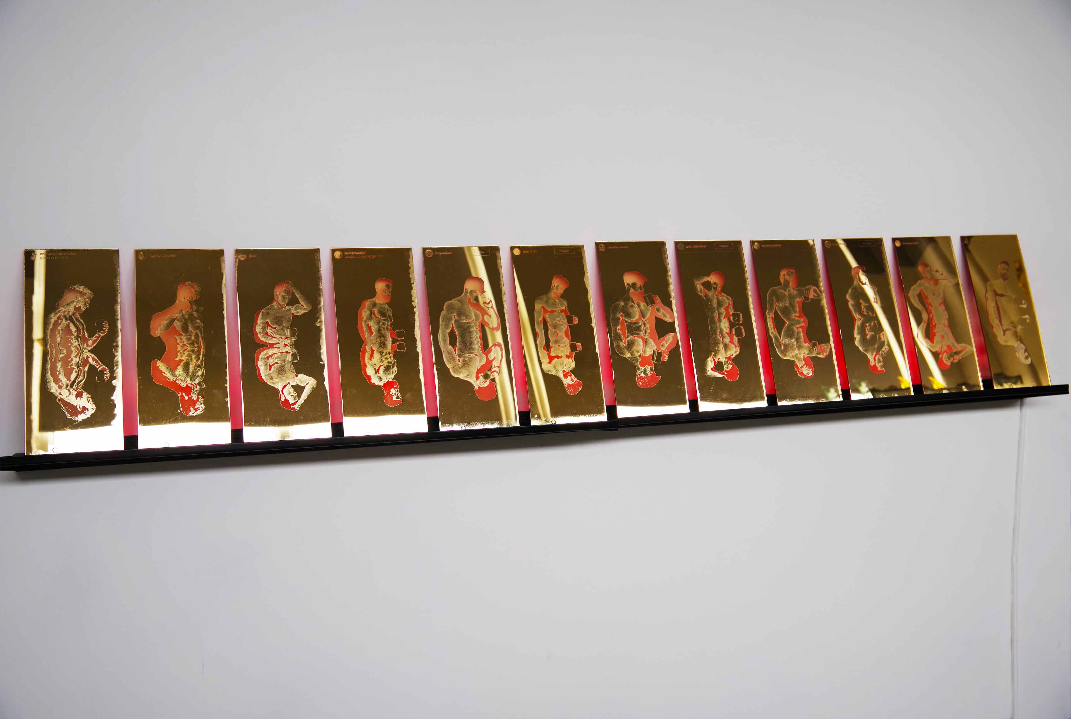 The domestic background in the images has been photoshopped out of the screenshots, a mirror image created, and laser cut onto the back of the gold acrylic.